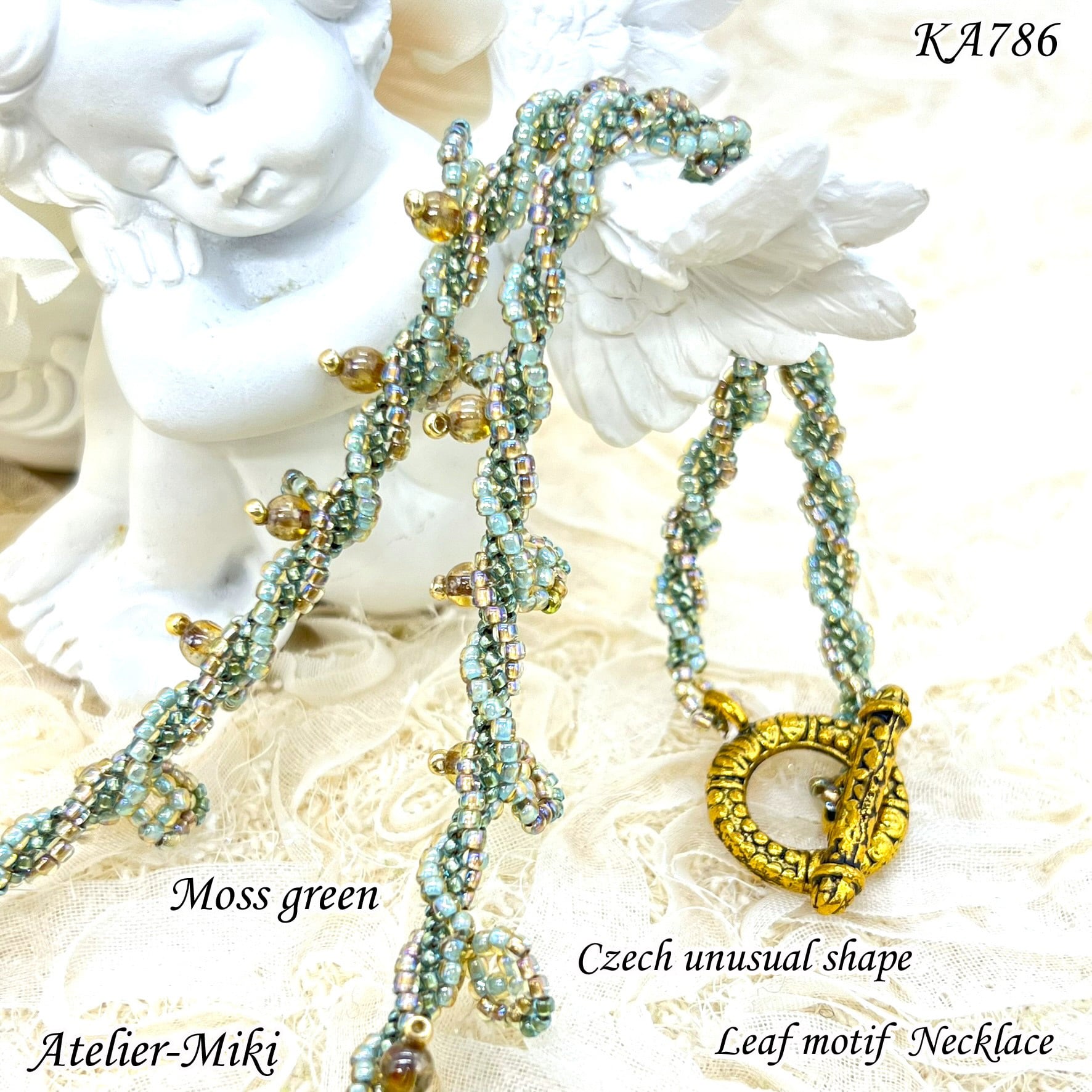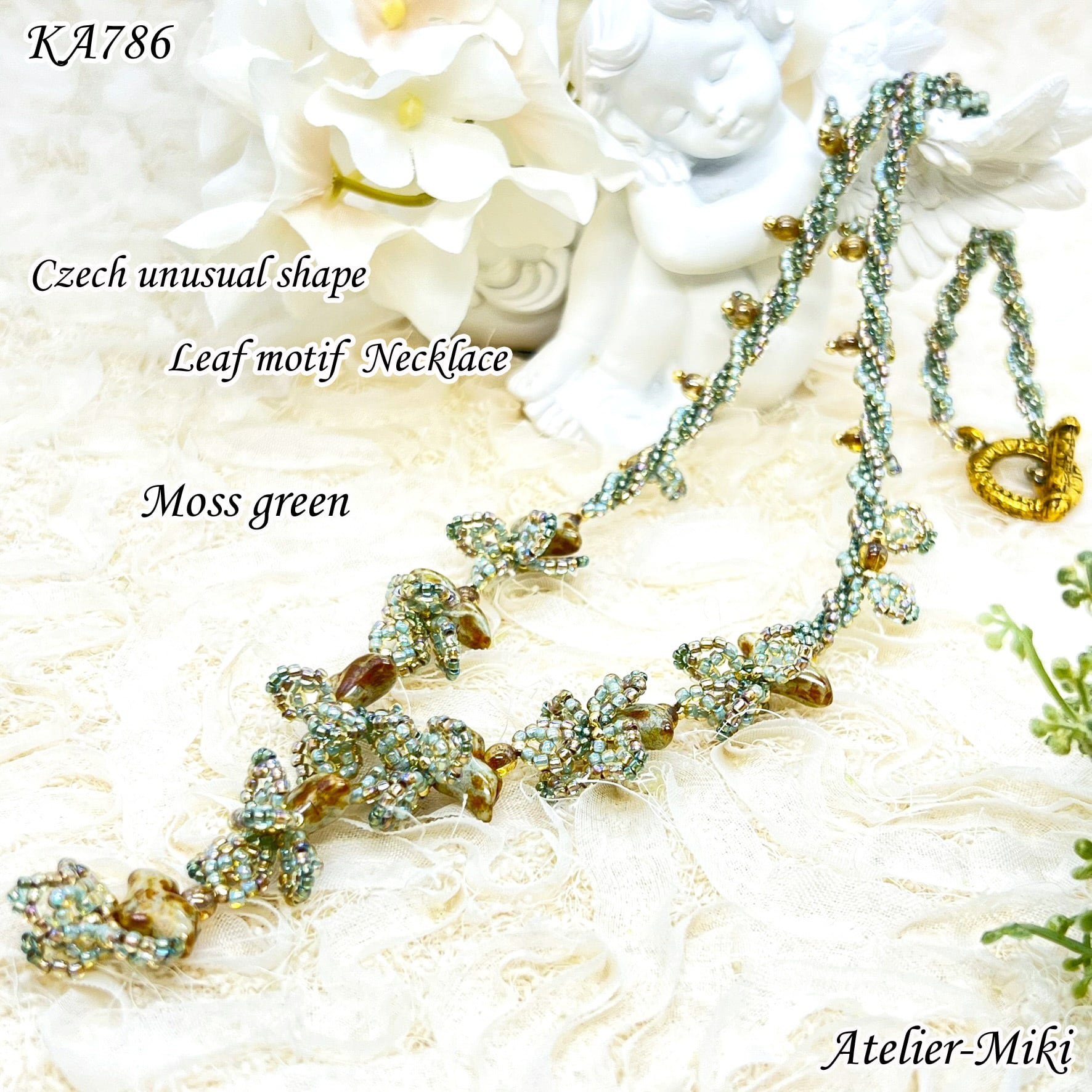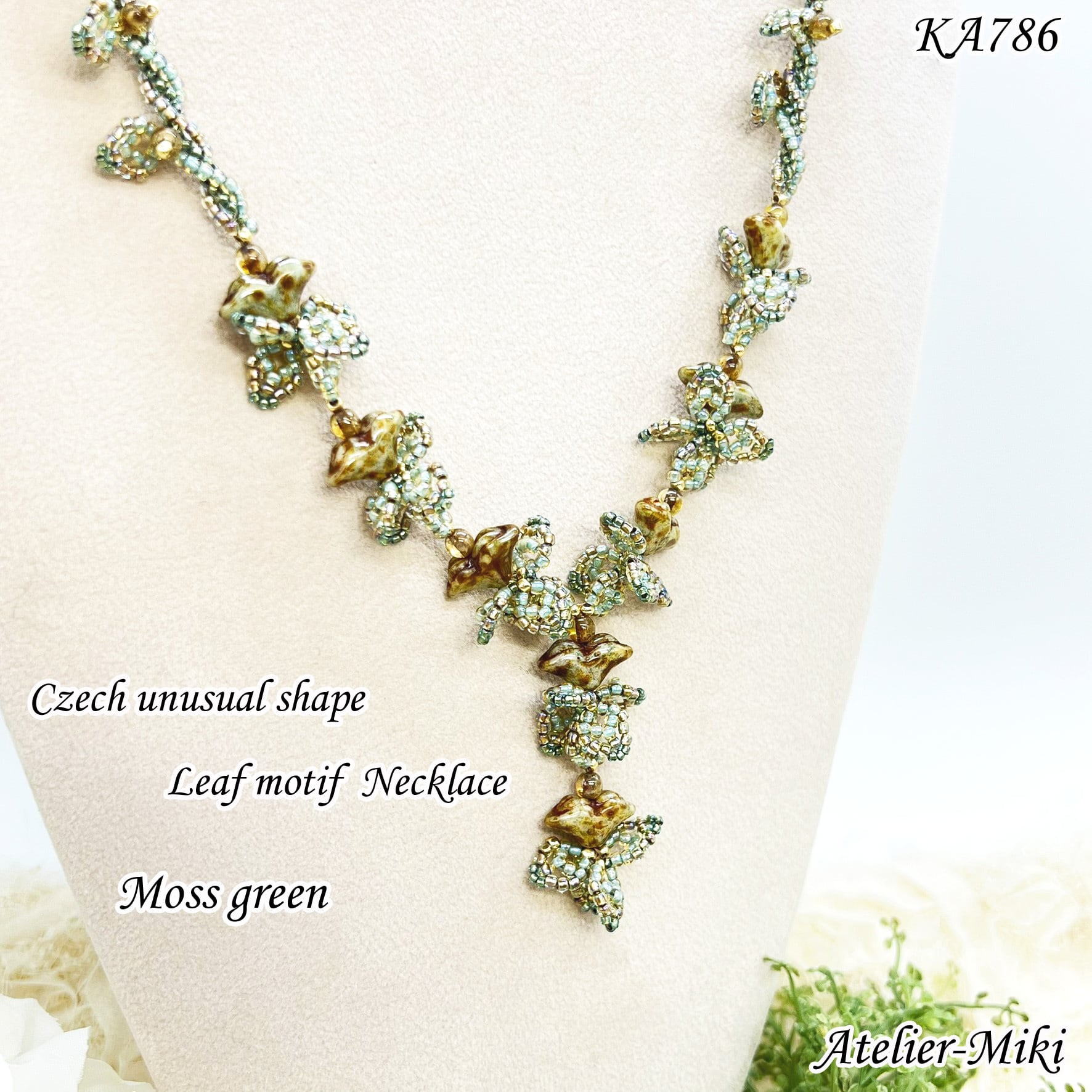 KA786 チェコ変形ビーズリーフモチーフ ネックレス【モスグリーン】