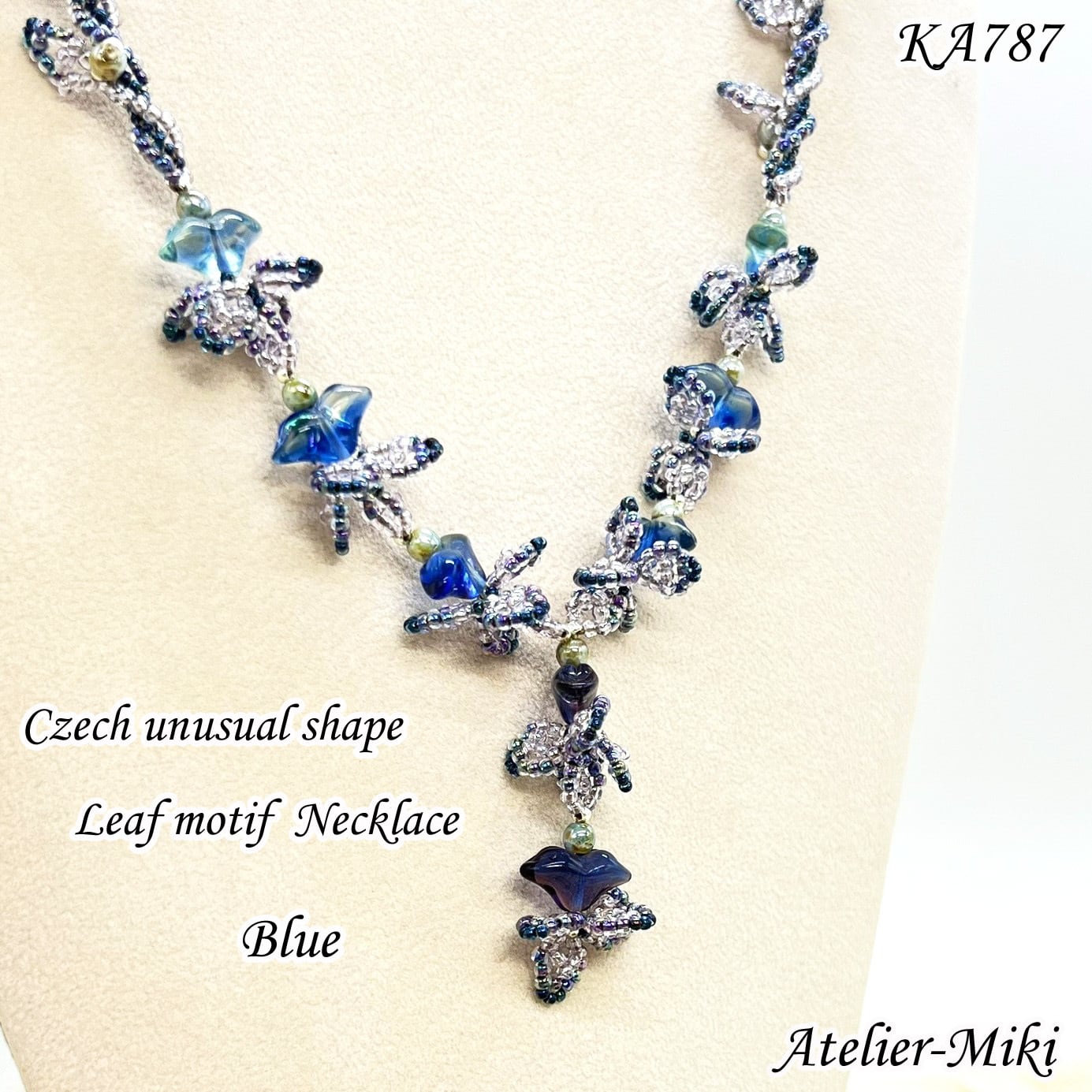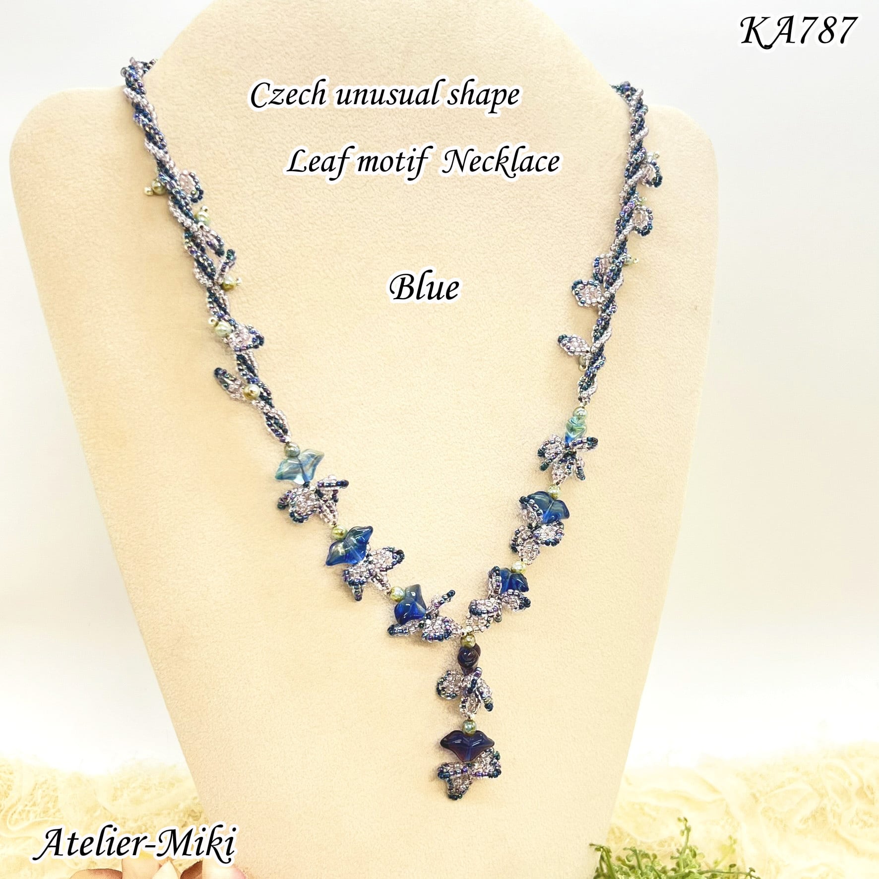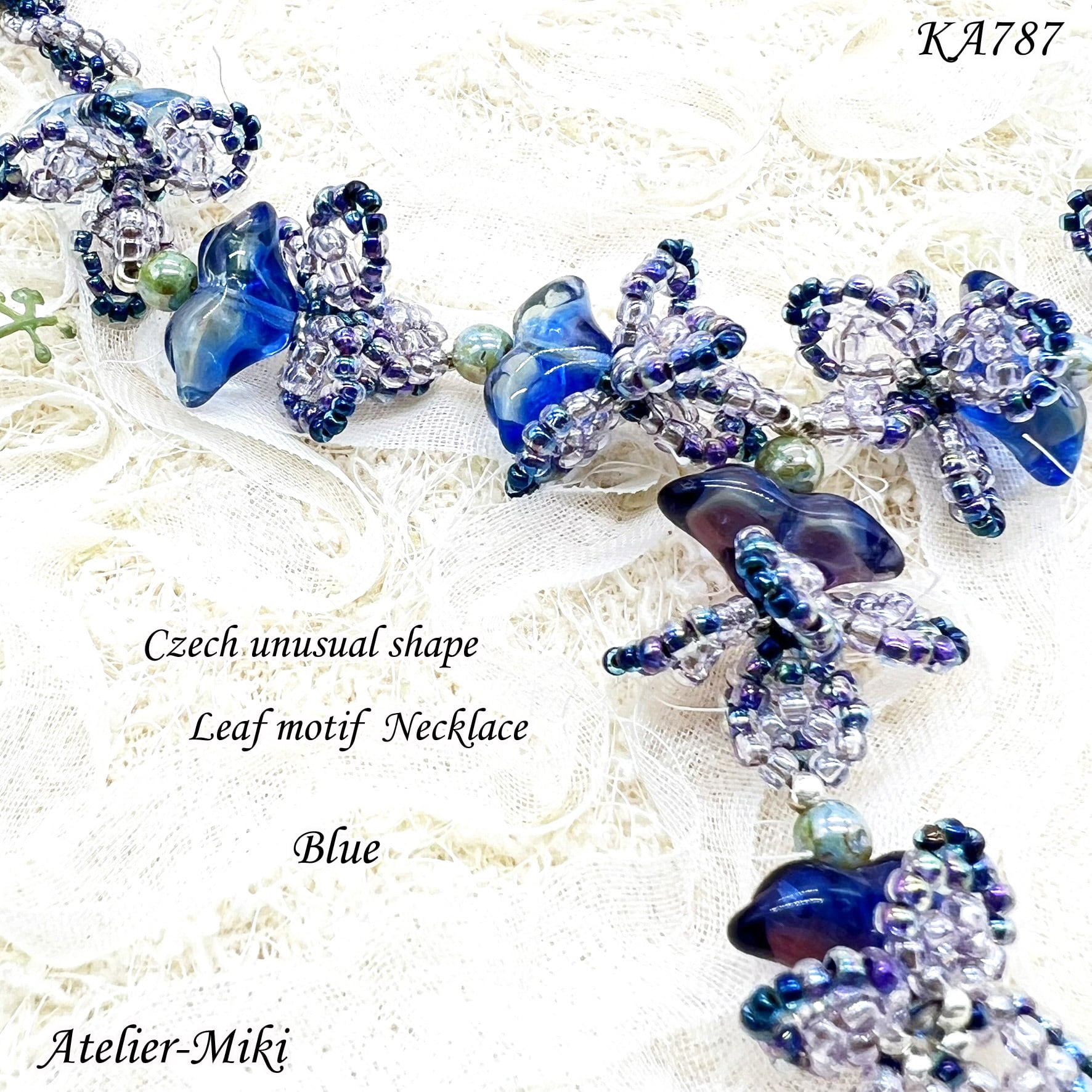 KA787 チェコ変形ビーズリーフモチーフ ネックレス【ブルー】