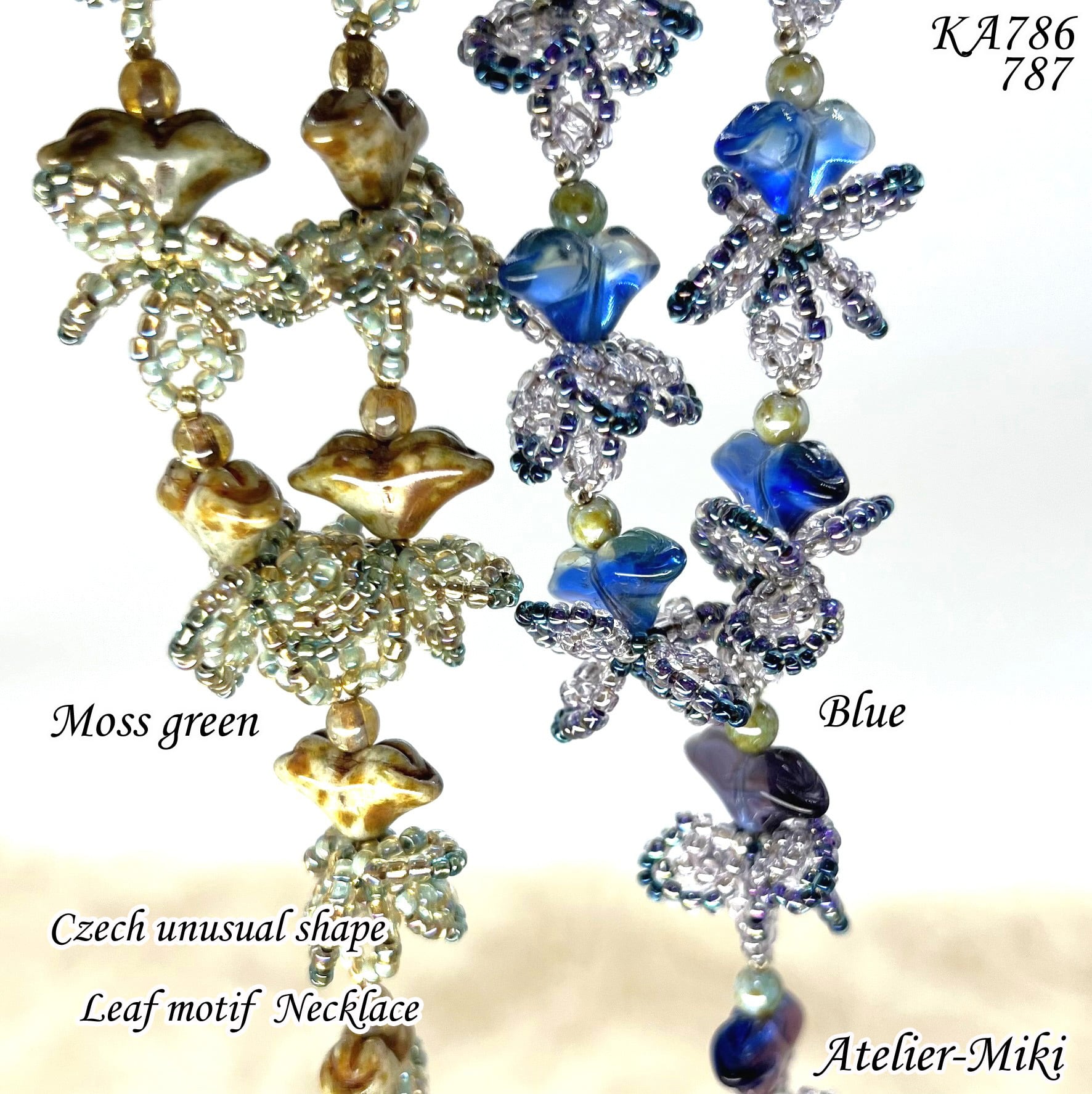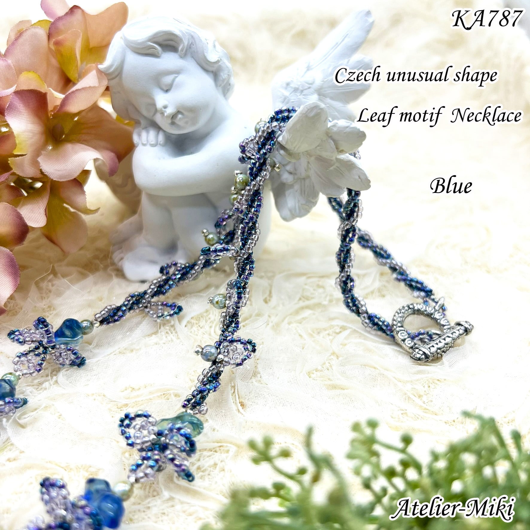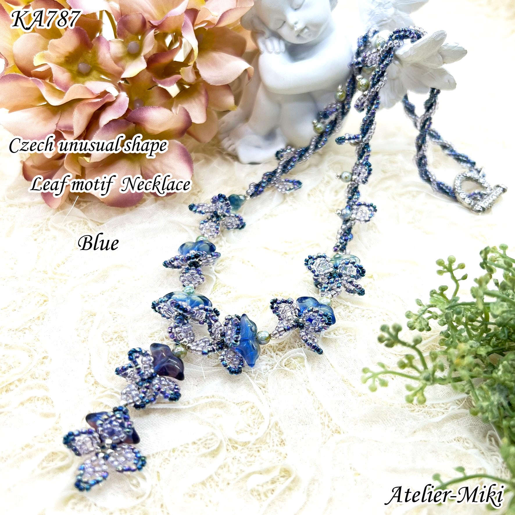 KA787 チェコ変形ビーズリーフモチーフ ネックレス【ブルー】