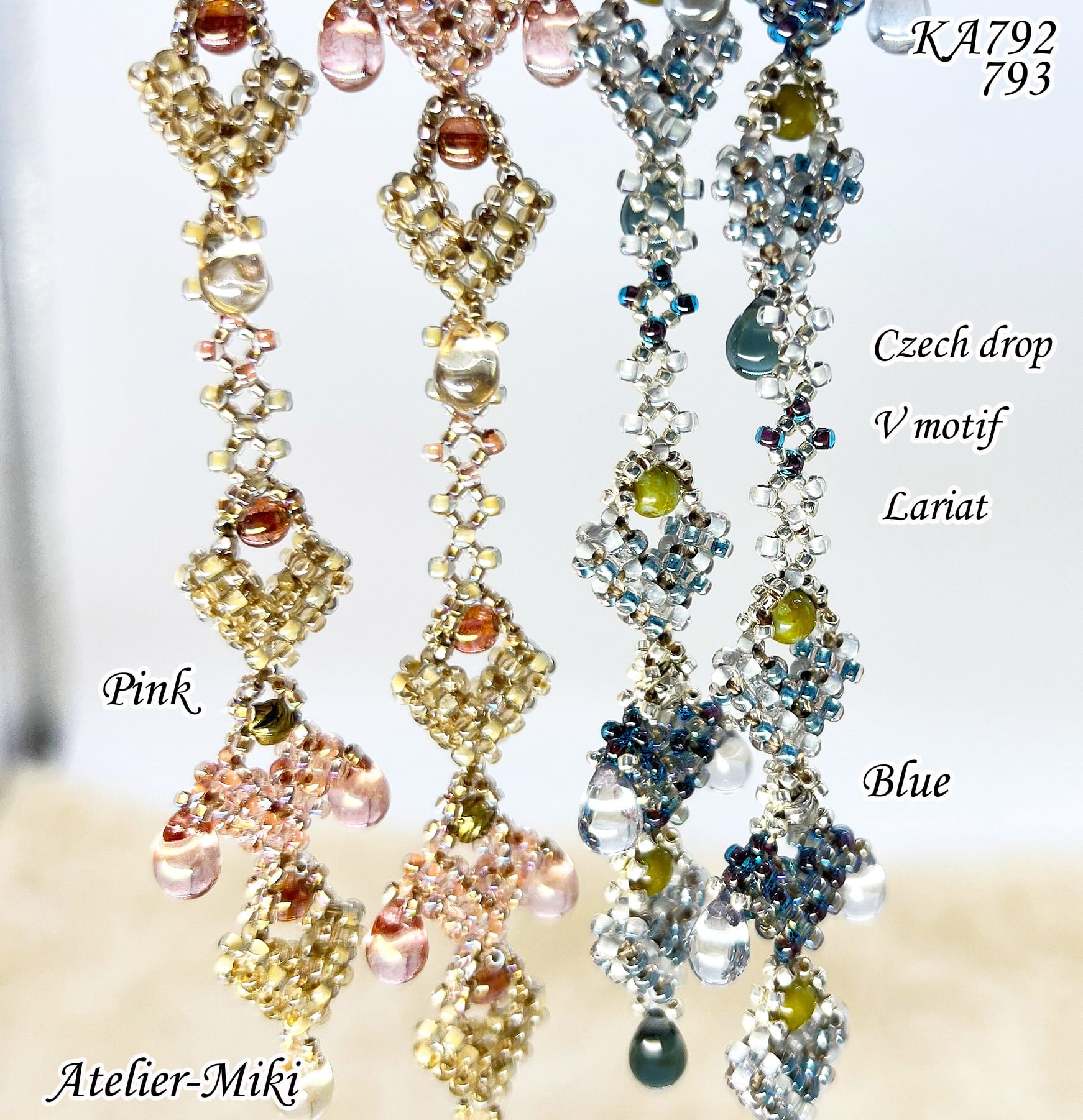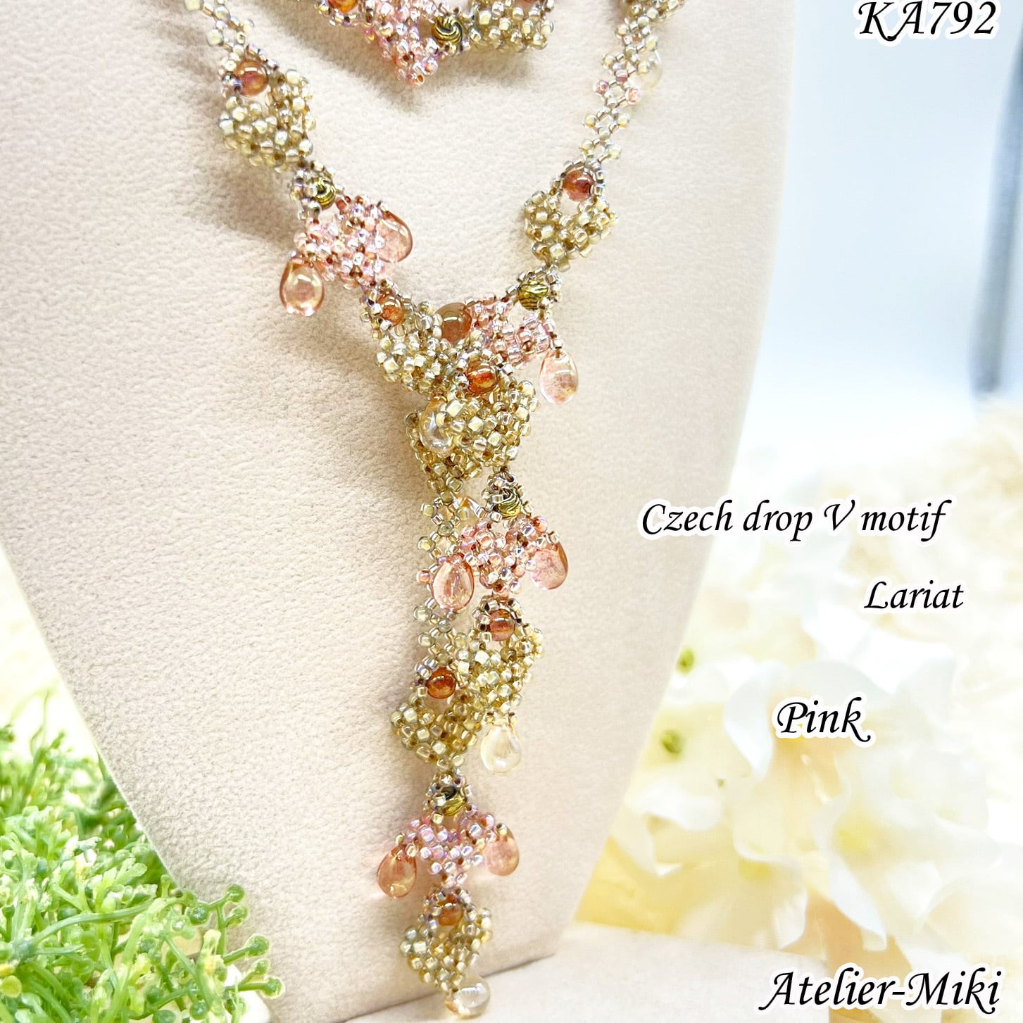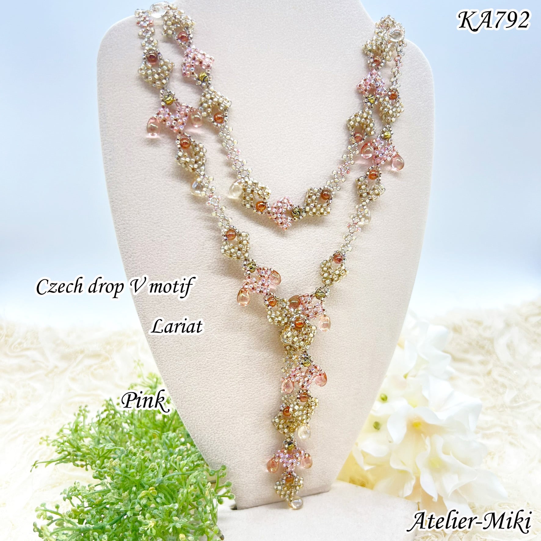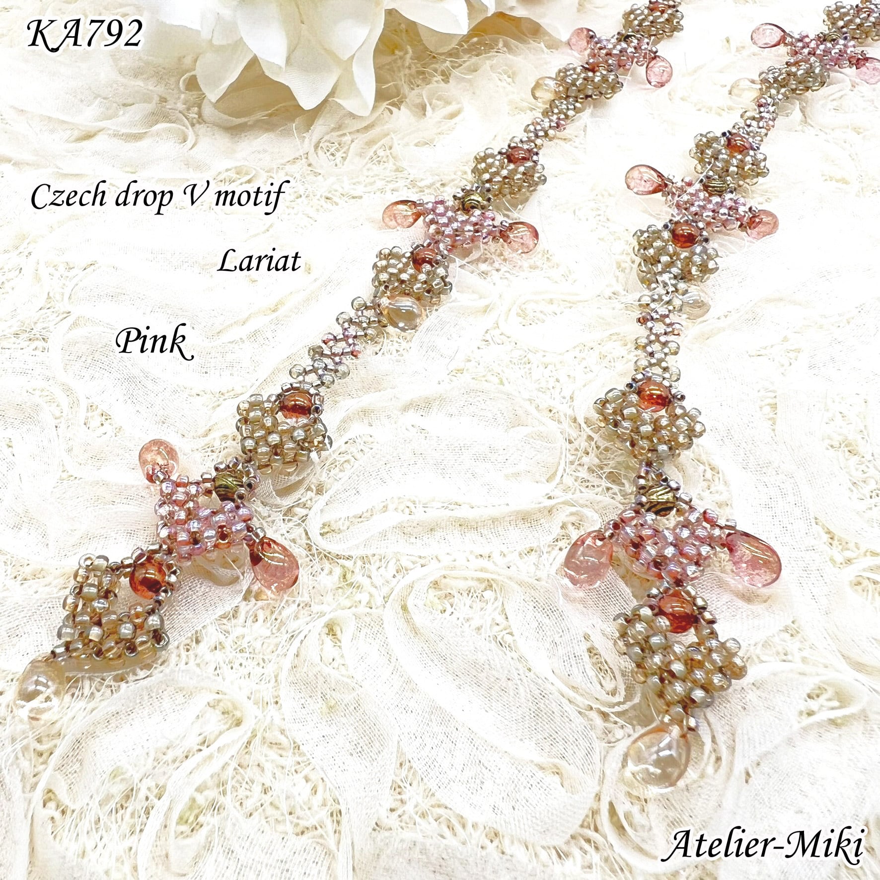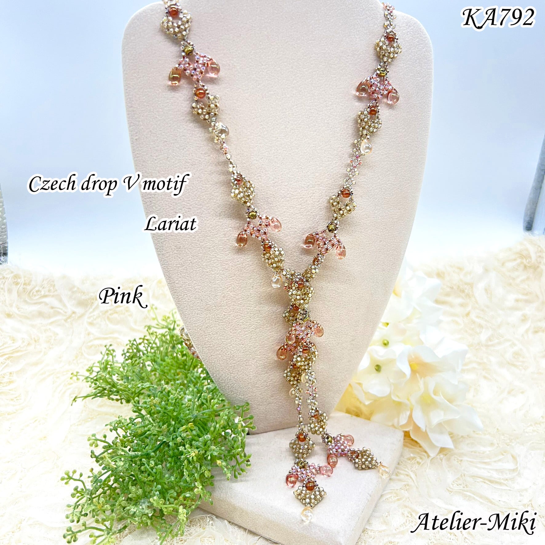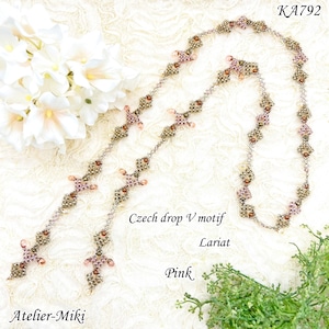 KA792 チェコドロップ Vモチーフ ラリエット【ピンク】