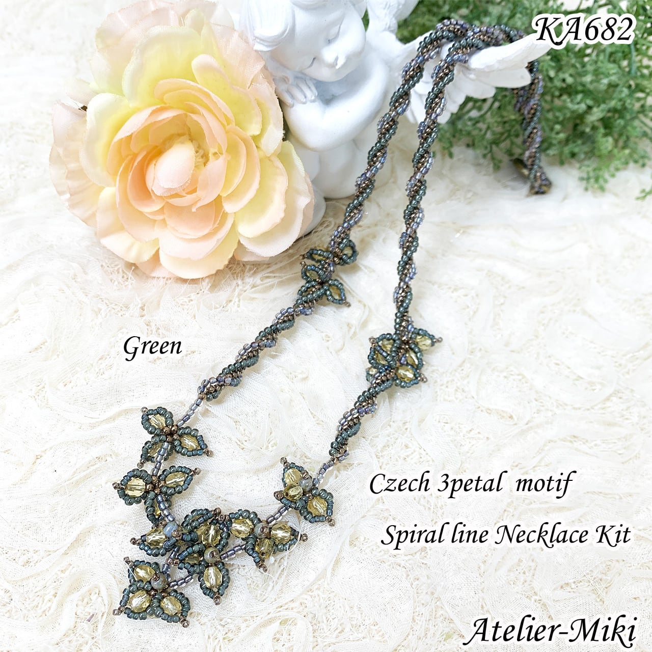KA682 ビーズキット チェコ3花弁モチーフ スパイラルライン ネックレス 【グリーン】