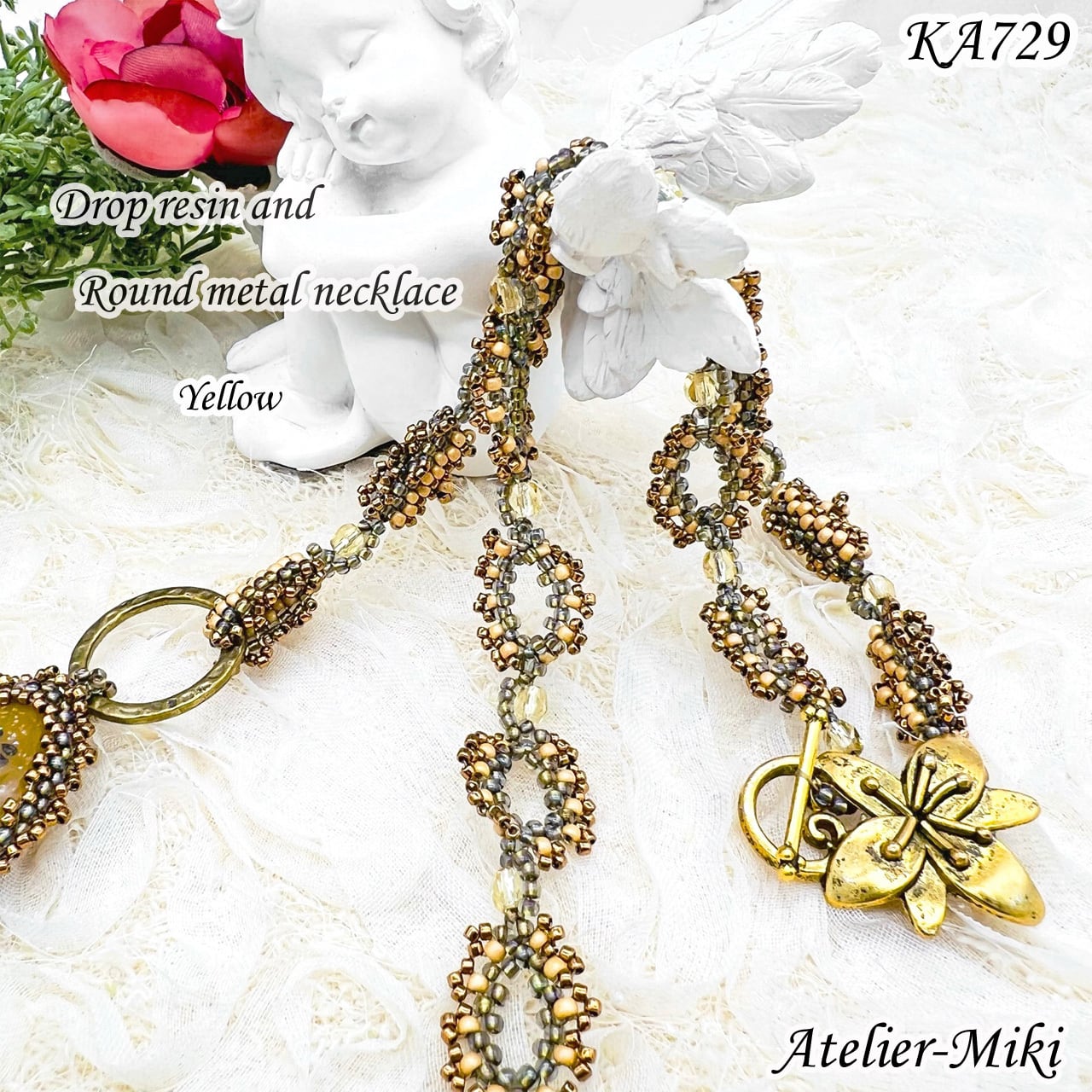 KA729 ビーズキット ドロップレジン アンド ラウンドメタル ネックレス【イエロー】