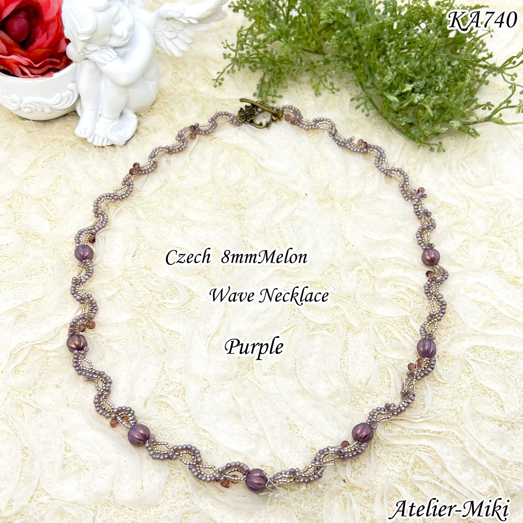 チェコメロンビーズをメインパーツに使用し、美しいウエーブラインと上品なパープル色が印象的です。デコルテをきれいに見せるレングスで上品な雰囲気が漂います。初心者の方でも作れるステッチですので、自分だけのオリジナルネックレスを作り上げてみませんか?プレゼントとしても喜んでいただけるデザインです。